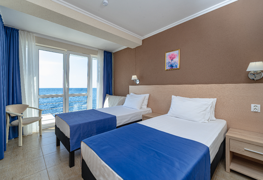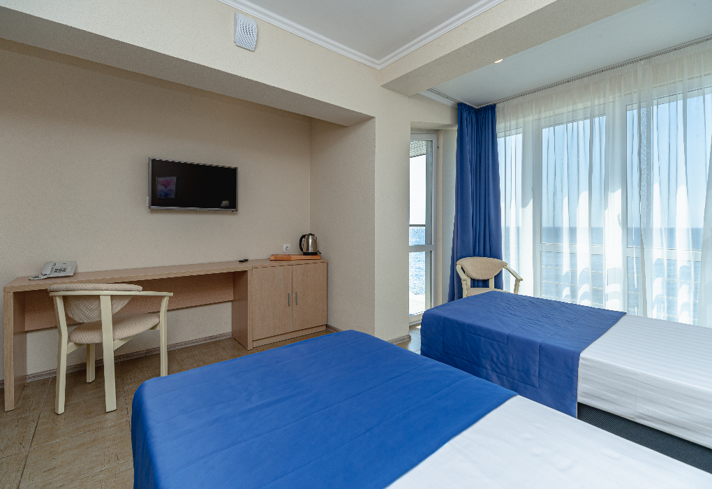 Площадь номера - 19,4 кв.м. 1 комната. 2 осн. места. располагаются на всех этажах, вид на море. В номере: телевизор; балкон; кондиционер; душ; фен; сейф; тапочки; пляжное полотенце; 1-спальные кровати; мини-холодильник; чайник; санузел; чайный набор; халат. 1 доп. место:
