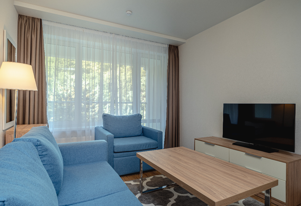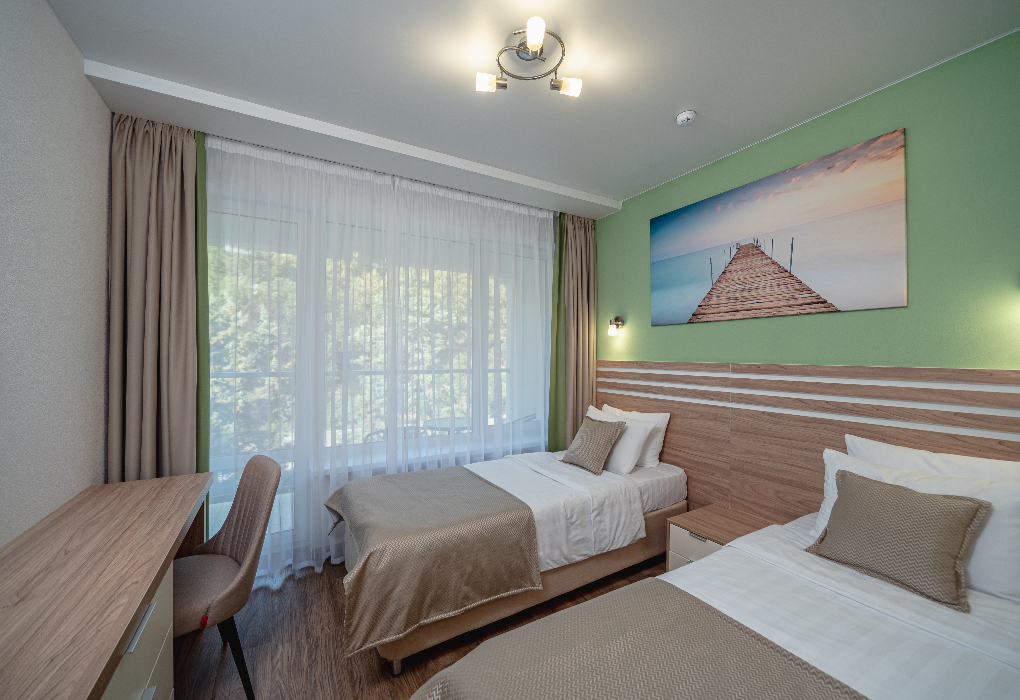 Площадь номера - 29,8 кв.м. 2 комнаты. 2 осн. места. располагаются со 2 по 4 этаж, вид на парк. В номере: телевизор; балкон; кондиционер; душ; фен; набор посуды; сейф; халаты; тапочки; пляжное полотенце; 1-спальные кровати; диван; кресло; мини-холодильник; чайник; санузел; чайный набор. 2 доп. места: