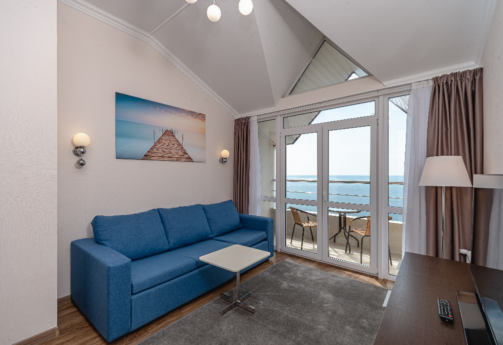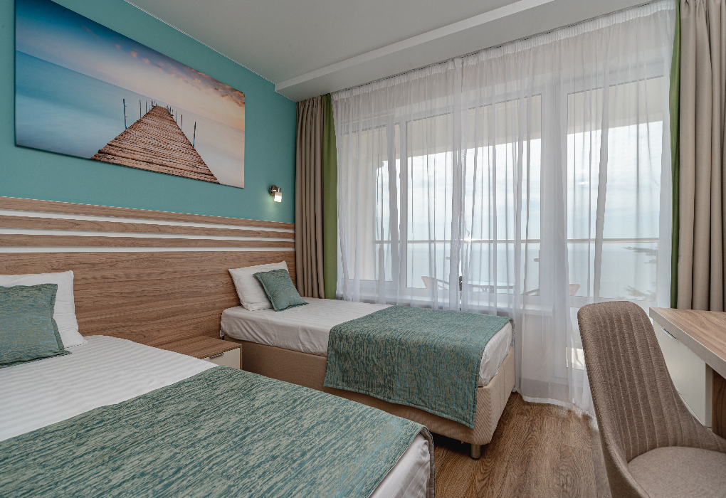 Площадь номера - 29,8 кв.м. 2 комнаты. 2 осн. места. располагаются со 2 по 4 этаж, вид на парк/море. В номере: телевизор; балкон; кондиционер; душ; фен; набор посуды; сейф; халаты; тапочки; пляжное полотенце; 1-спальные кровати; диван; кресло; мини-холодильник; чайник; санузел; чайный набор. 2 доп. места: