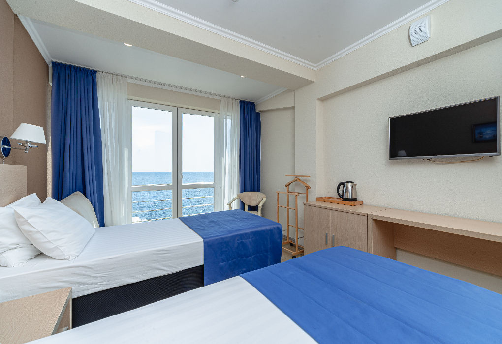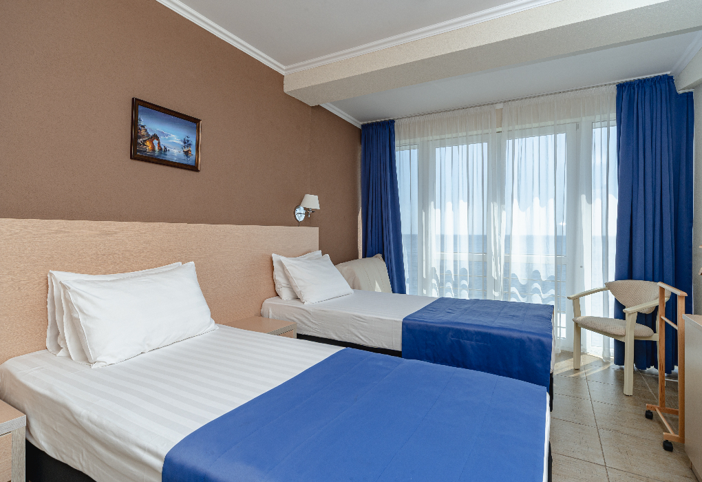 Площадь номера - 15 кв.м. 1 комната. 2 осн. места. располагаются с 1 по 3 этаж, вид на море. В номере: телевизор; кондиционер; душ; фен; сейф; пляжное полотенце; 1-спальные кровати; мини-холодильник; чайник; санузел; чайный набор. 1 доп. место: