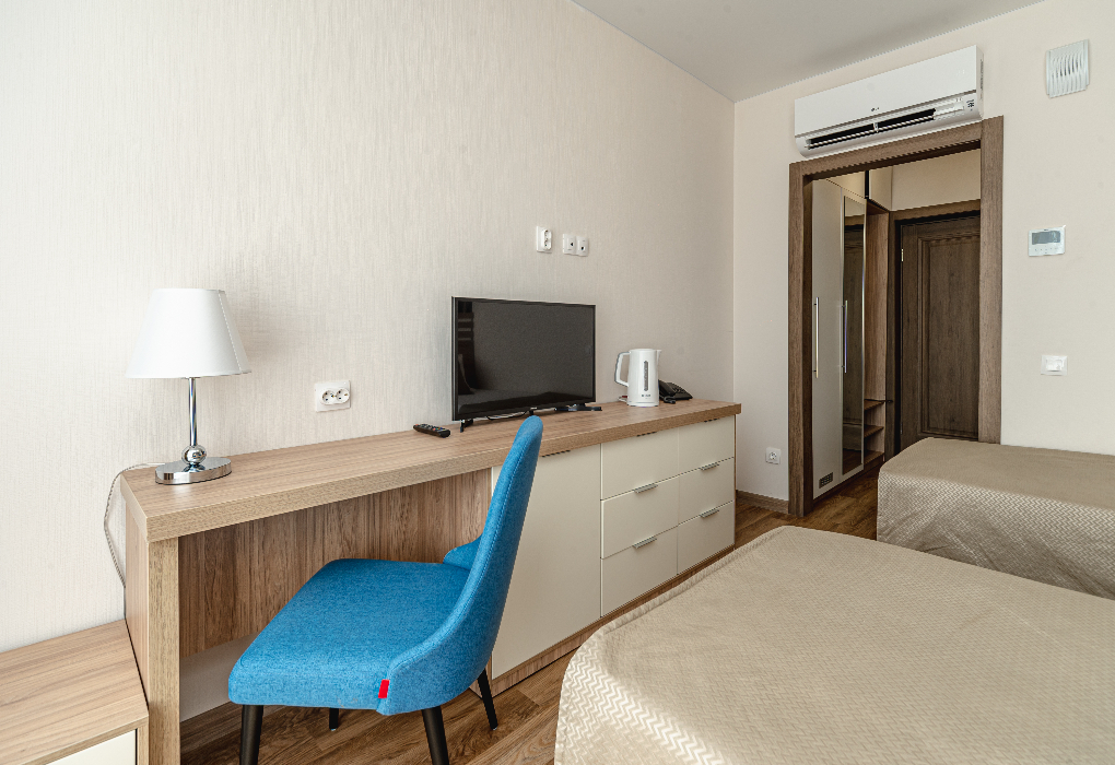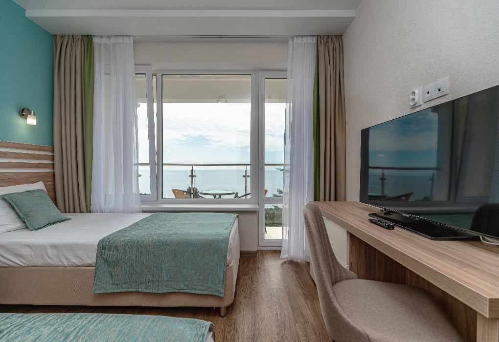 Площадь номера - 13,2 кв.м. 1 комната. 2 осн. места. располагаются со 2 по 4 этаж, вид на море. В номере: телевизор; балкон; кондиционер; душ; фен; сейф; пляжное полотенце; 1-спальные кровати; мини-холодильник; чайник; санузел; чайный набор.