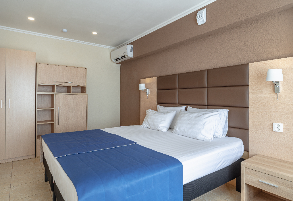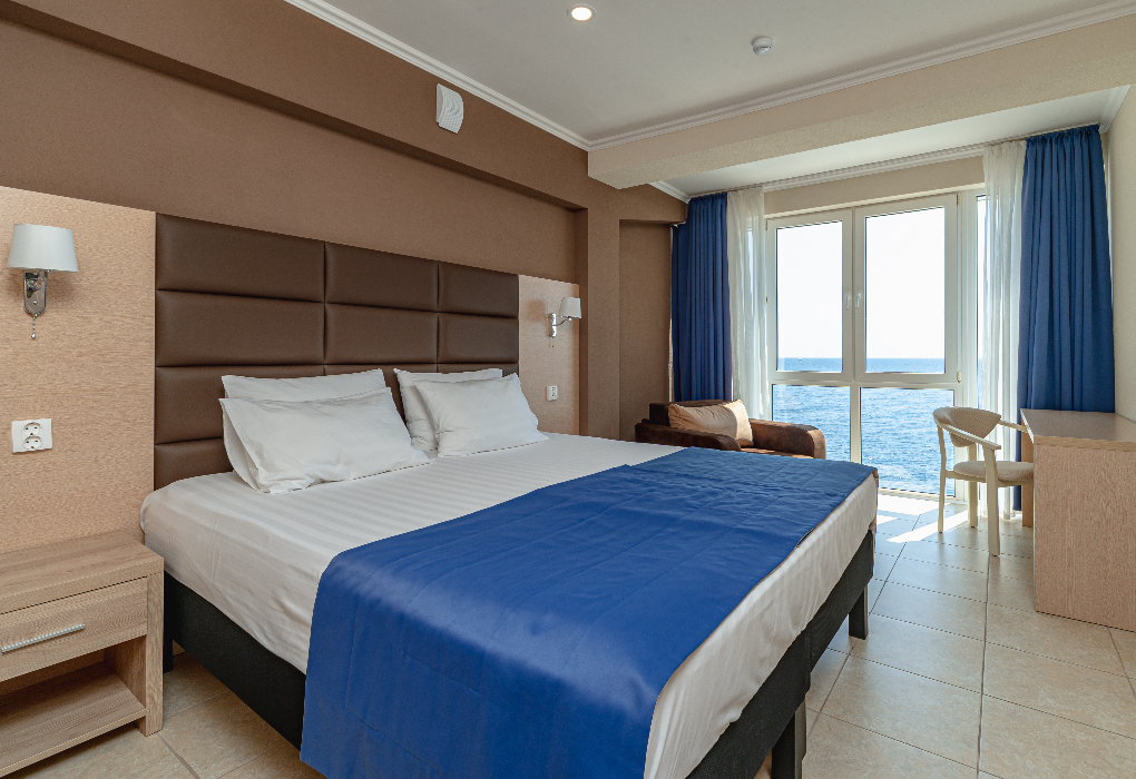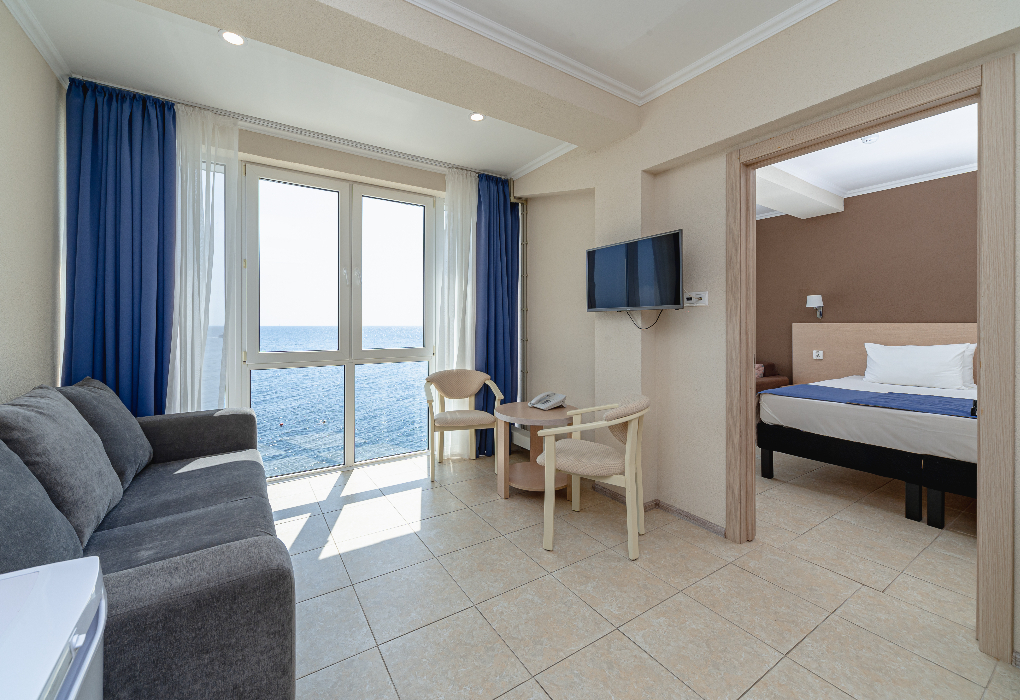 Площадь номера - 44,5 кв.м. 3 комнаты. 3 осн. места. располагаются на 2 и 3 этаже, вид на море. В номере: телевизор; кондиционер; ванна; фен; набор посуды; сейф; халаты; тапочки; пляжное полотенце; 1-спальные кровати; диван; кресло; мини-холодильник; чайник; санузел; чайный набор. 2 доп. места:
