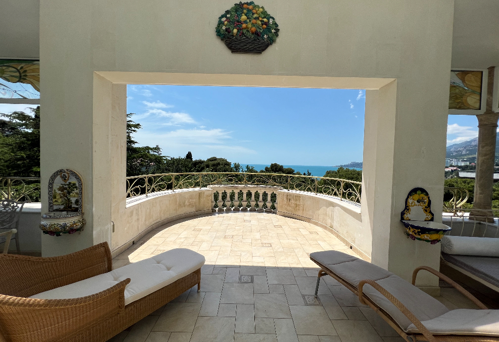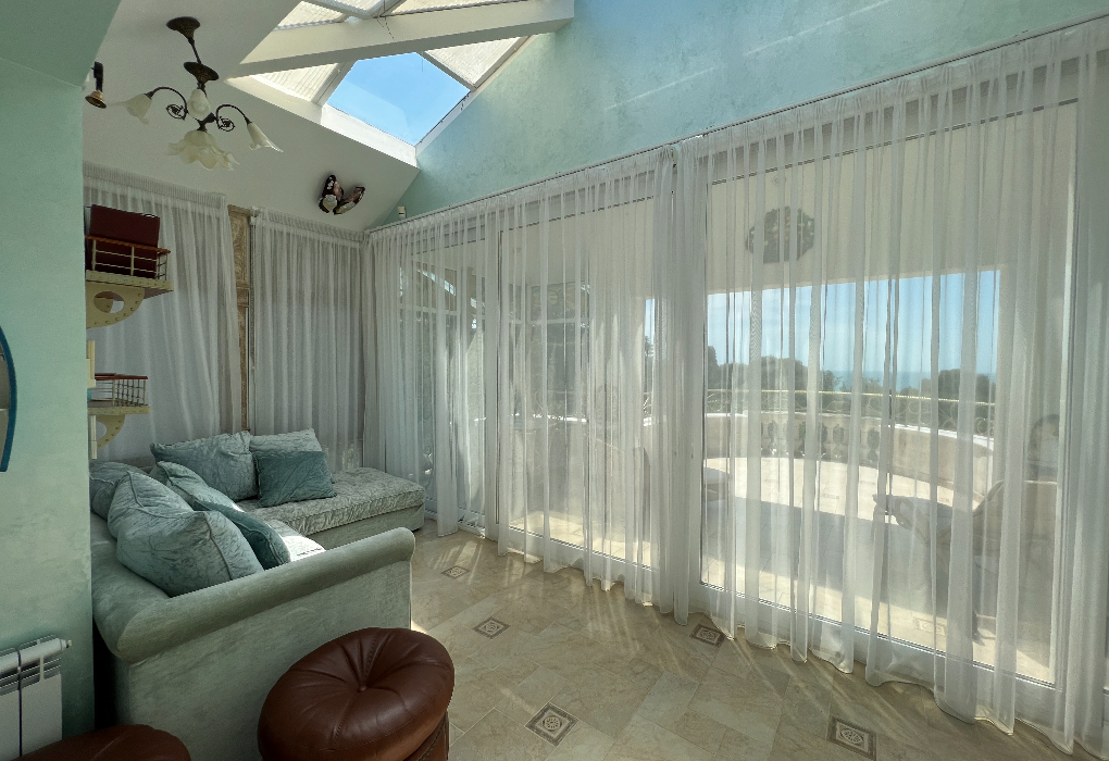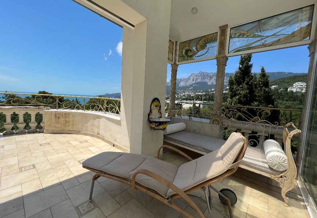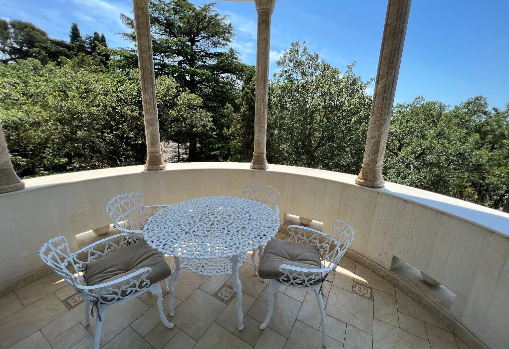 На пятом этаже виллы в уютной обстановке мансарды со средиземноморским интерьером, полуоткрытой террасой с панорамным видом на горы, море и старинный парк приятно провести время.. В номере: телевизор; холодильник; балкон; кондиционер; ванна; фен; набор посуды; сейф; халаты; тапочки; пляжное полотенце; 2-спальные кровати; чайник; чайный набор.