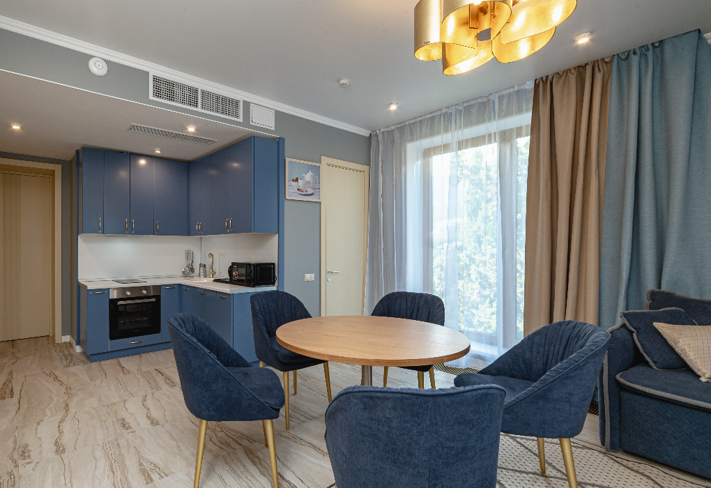 Площадь номера - 70,1 кв.м. 3 комнаты. 4 осн. места. располагаются на всех этажах. В номере: телевизор; кондиционер; душ; фен; набор посуды; сейф; халаты; тапочки; пляжное полотенце; 2-спальная кровать; 2 балкона; мини-холодильник; чайник; санузел; чайный набор; кухонный уголок. 1 доп. место: